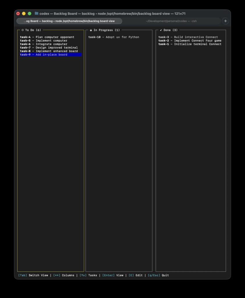 Connect four is a simple game for two players. You can find multiple versions online, but what if you can create one yourself? I wanted to have one for the command line. Below is a movie of what I created using Backlog.md and Codex. What you see here took me around 2 hours, including installation and learning both tools. Before working on this game, I had not used them before.